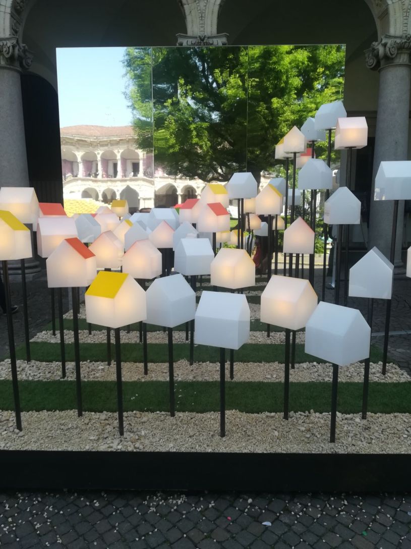 Sullo sfondo, “Alla scoperta dell’infinito” di Lorenzo Damiani con Ikea Italia. Una piccola abitazione, idealmente trasportabile grazie a una maniglia sul tetto, invita ad esplorare le infinite possibilità di trasformazione degli arredi modulari, capaci di adattarsi alle evoluzioni della vita domestica.